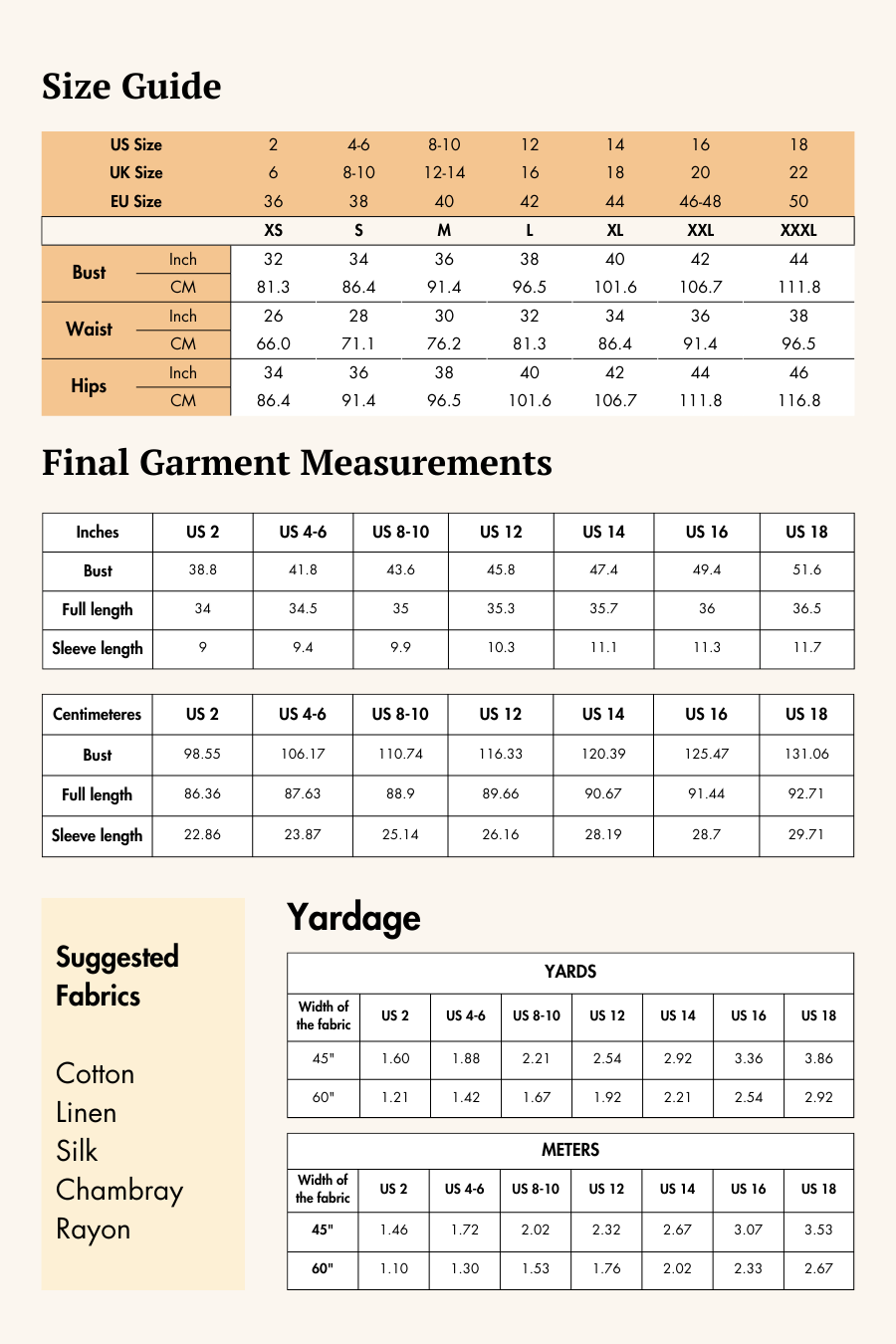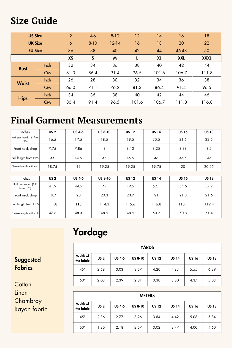 Our sewing patterns are initially designed based on a basic block drafted for a woman with the following measurements: height 5'6", bust 34", and waist 28", corresponding to size S on our size chart. From there, the patterns are graded both up and down to accommodate various sizes.