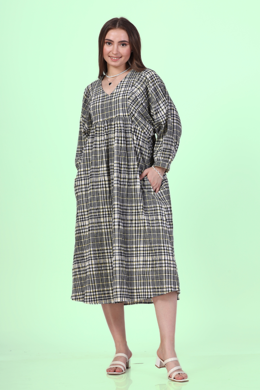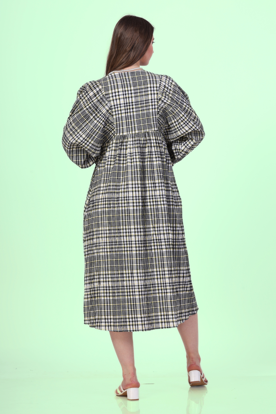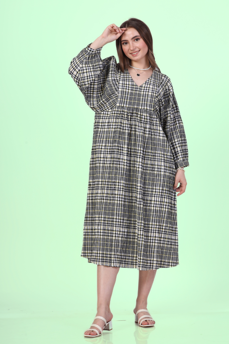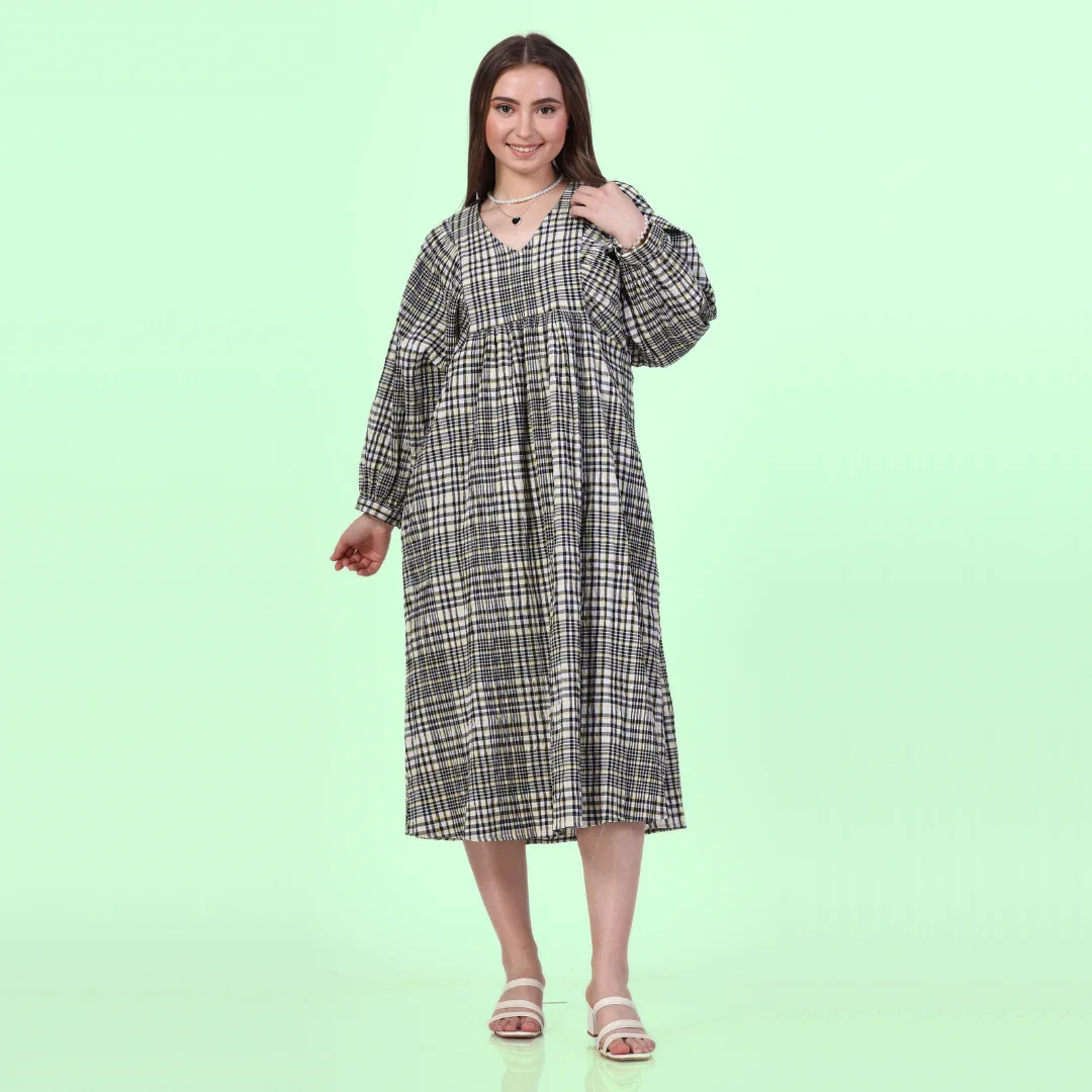 This midi dress features a classic long-sleeve design and relaxed fit.The gathered waist creates a flattering silhouette that enhances the natural shape, while the flowy skirt allows for comfortable movement and an elegant appearance.