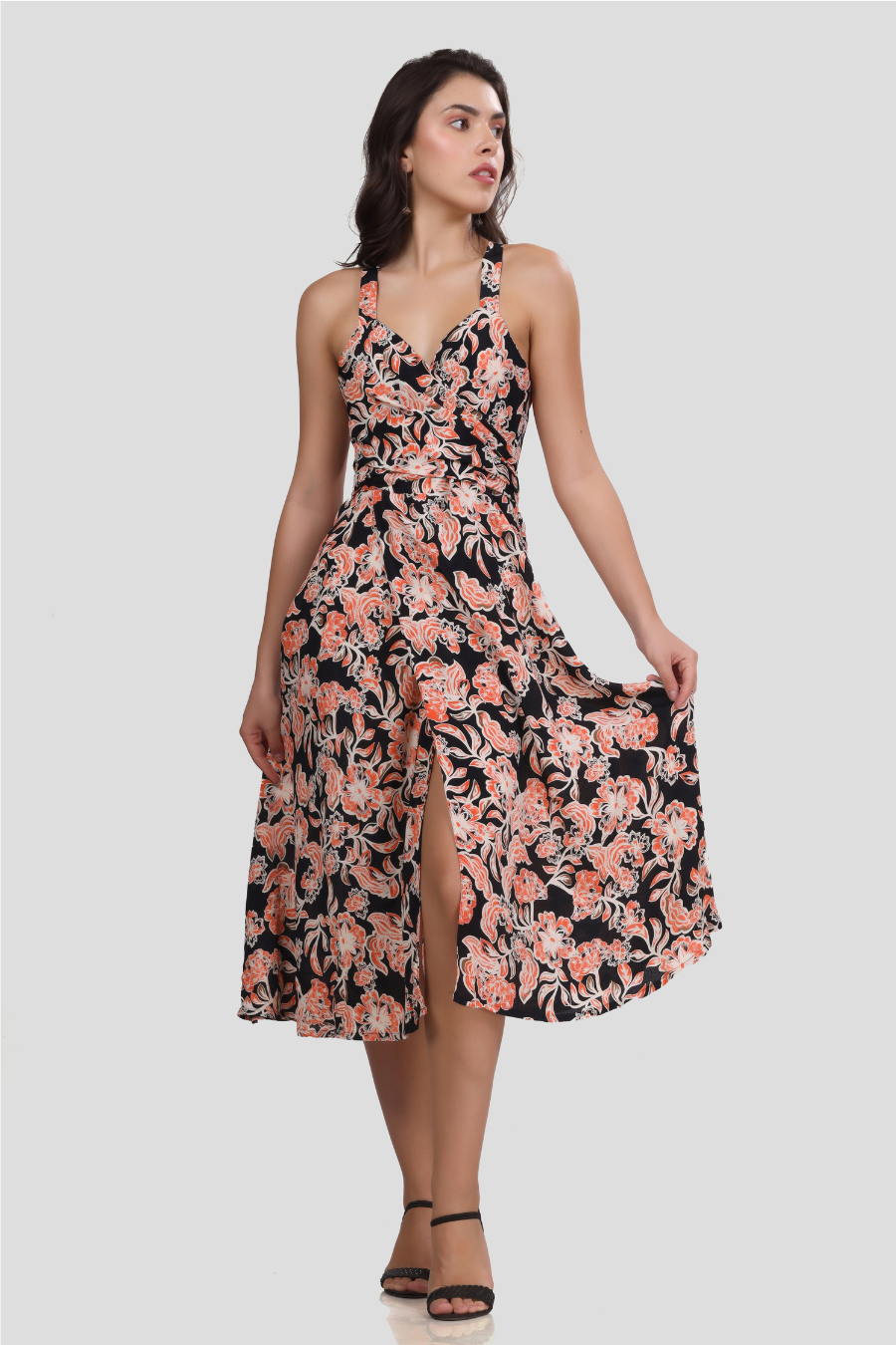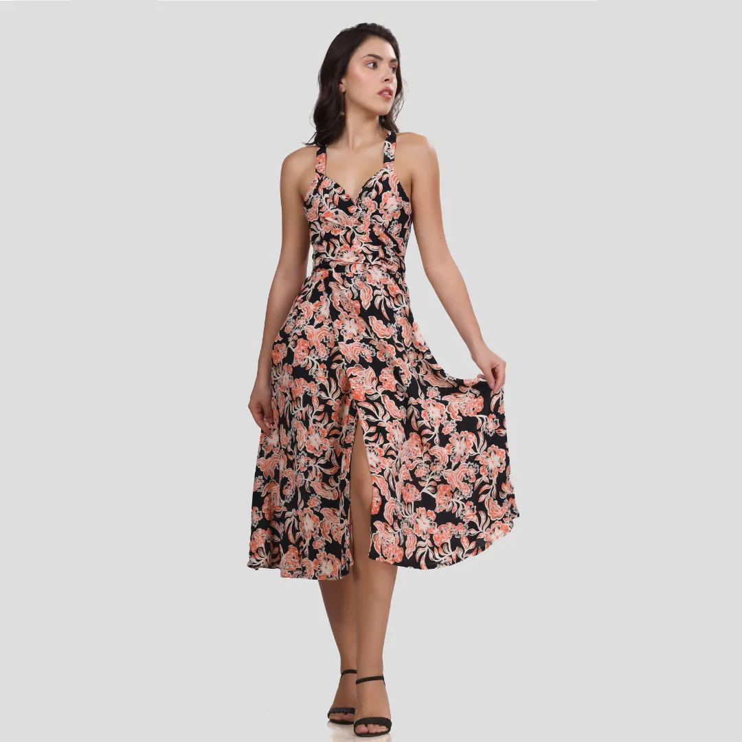 This elegant wrap midi dress features a sweetheart neckline and stylish cross-back straps. The fitted bodice accentuates the waist, flowing into a flared skirt that offers graceful movement. The wrap design provides a customizable fit, and the front slit adds a touch of allure