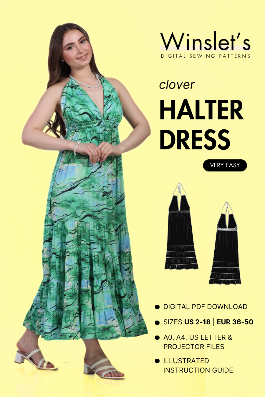 The dress features a fitted bodice that ties at the back for an adjustable fit, ensuring both comfort and support. The halter neckline highlights the shoulders and collarbone, while the tiered skirt offers a flowing and flattering silhouette.
