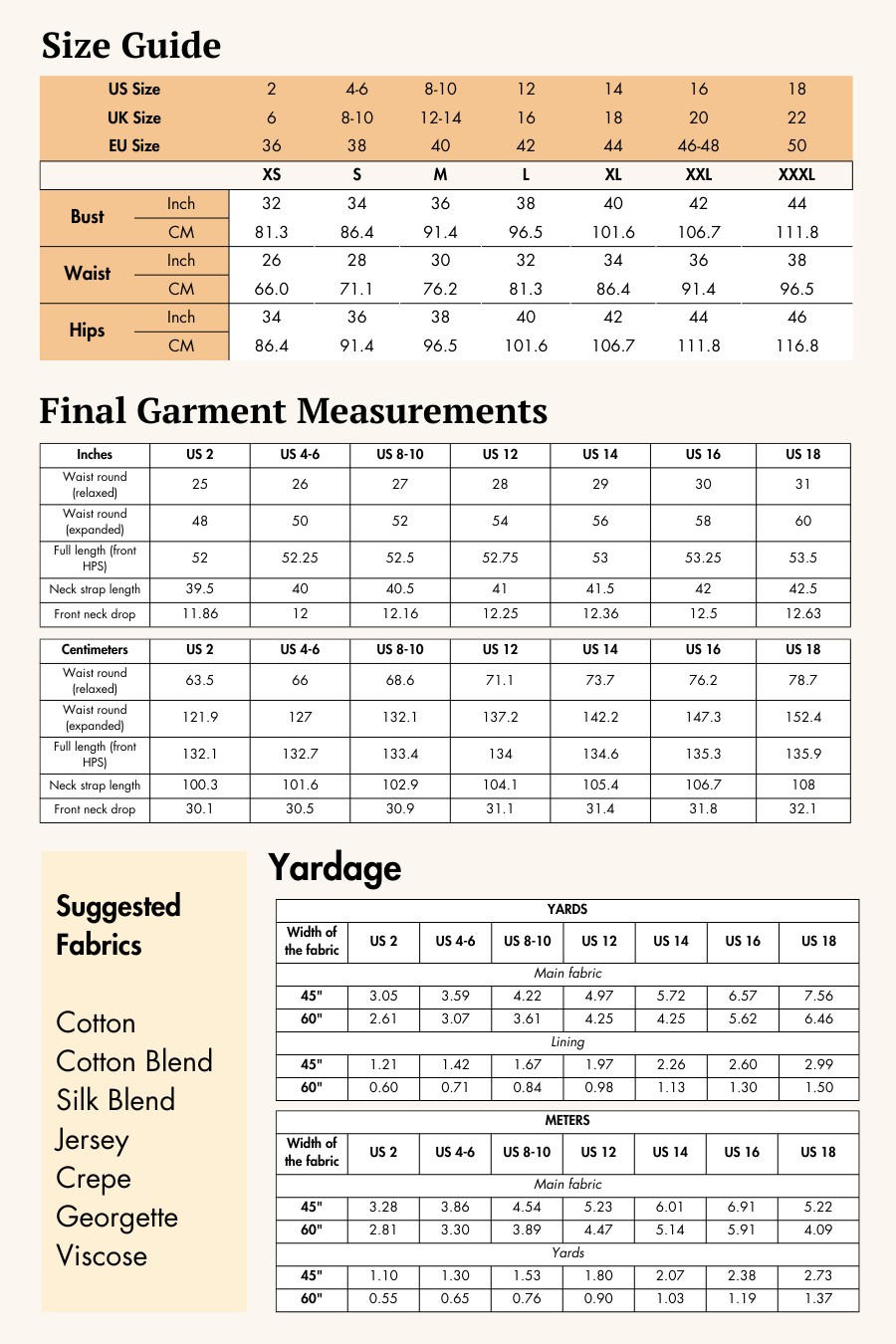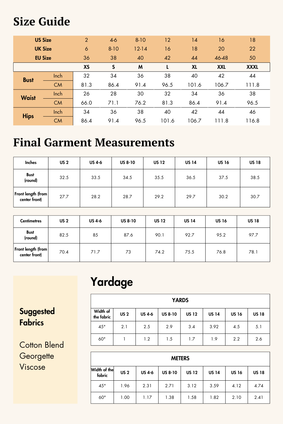 If your measurements fall between sizes, consider the fit you prefer (looser or tighter) and the type of fabric you'll use, as some fabrics have more give. All patterns include finished garment measurements which can be helpful to know how much ease or extra room is built into the design.