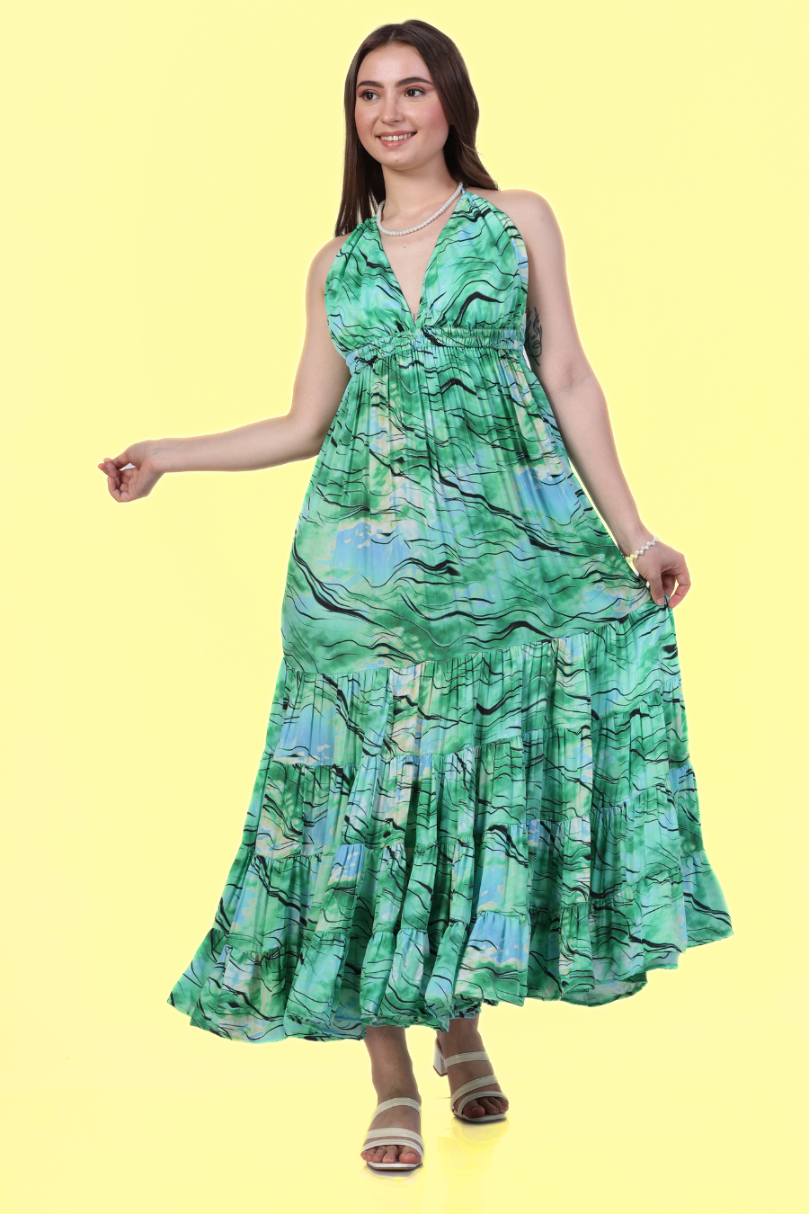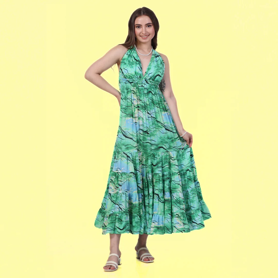 This elegant halter neck maxi dress features a flattering halter neckline that ties at the back, providing a secure and adjustable fit. The dress has a fitted bodice that flows into a tiered skirt, adding a touch of movement and grace. The open back design enhances the overall look, making this dress a perfect choice for both casual and formal occasions.