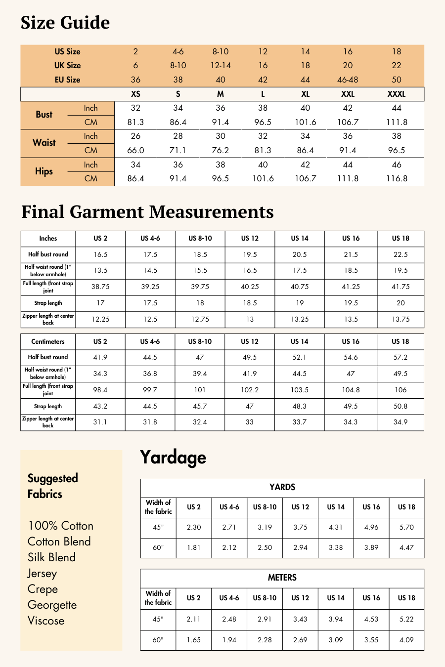 Before selecting a pattern size, take accurate measurements of your bust, waist, and hips. Choose the size from our chart that closely aligns with your measurements.