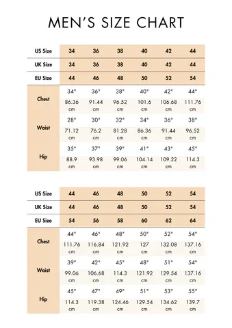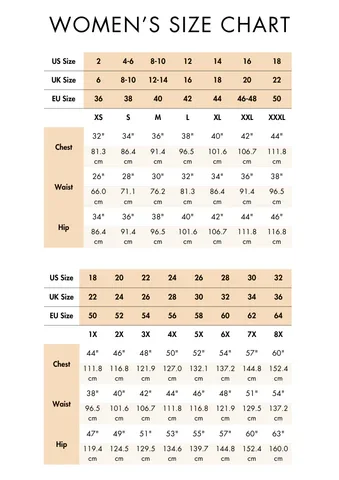 Available in US 2 -32 | UK 6 - 36 and EU 36 - 64, these cover XS - 5XL sizes.