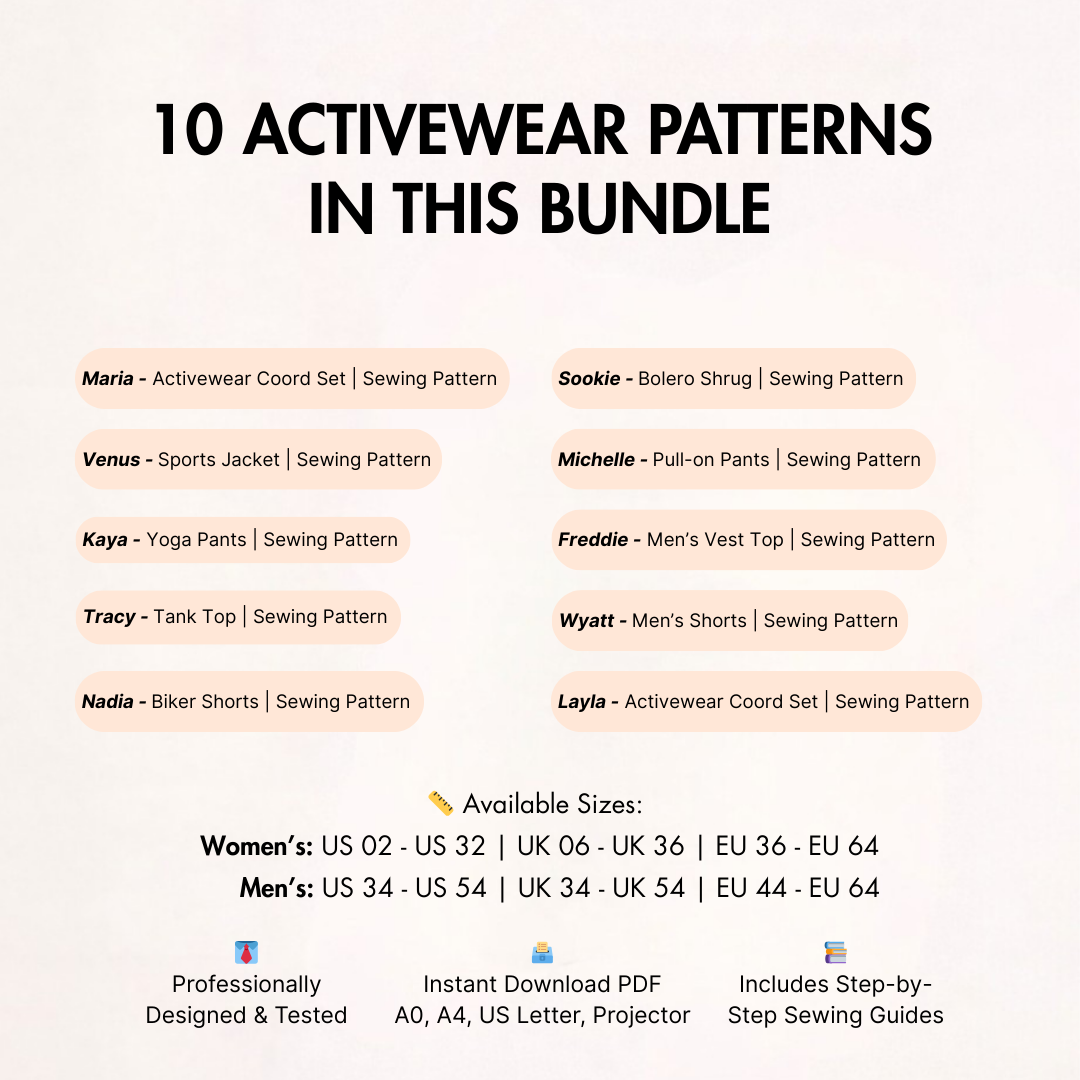 From yoga pants to sharp boleros, this 10-pattern bundle has everything you need to sew a full activewear wardrobe. Whether you're stitching for yourself or someone else, these tried-and-tested designs are made to fit, wear, and repeat.