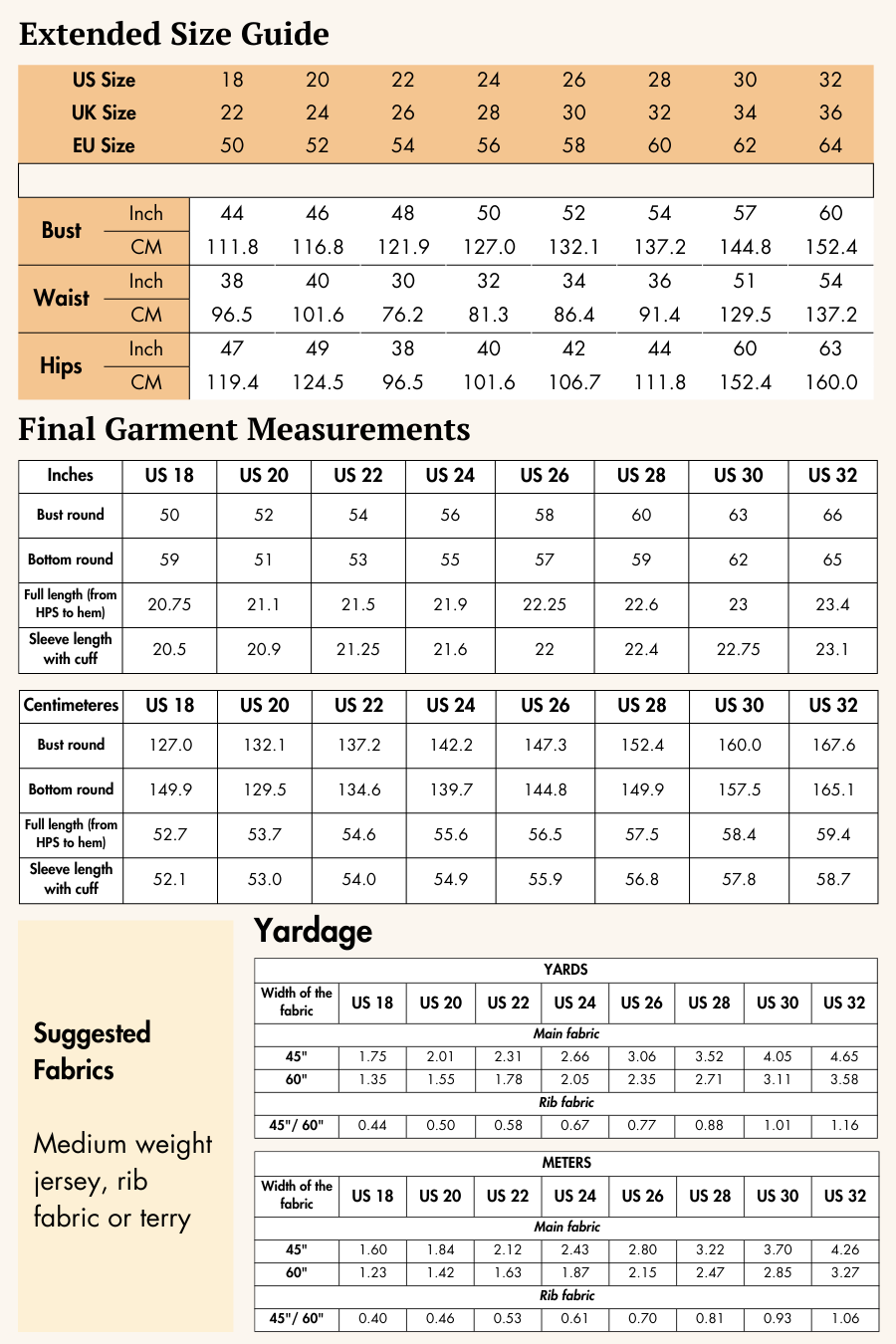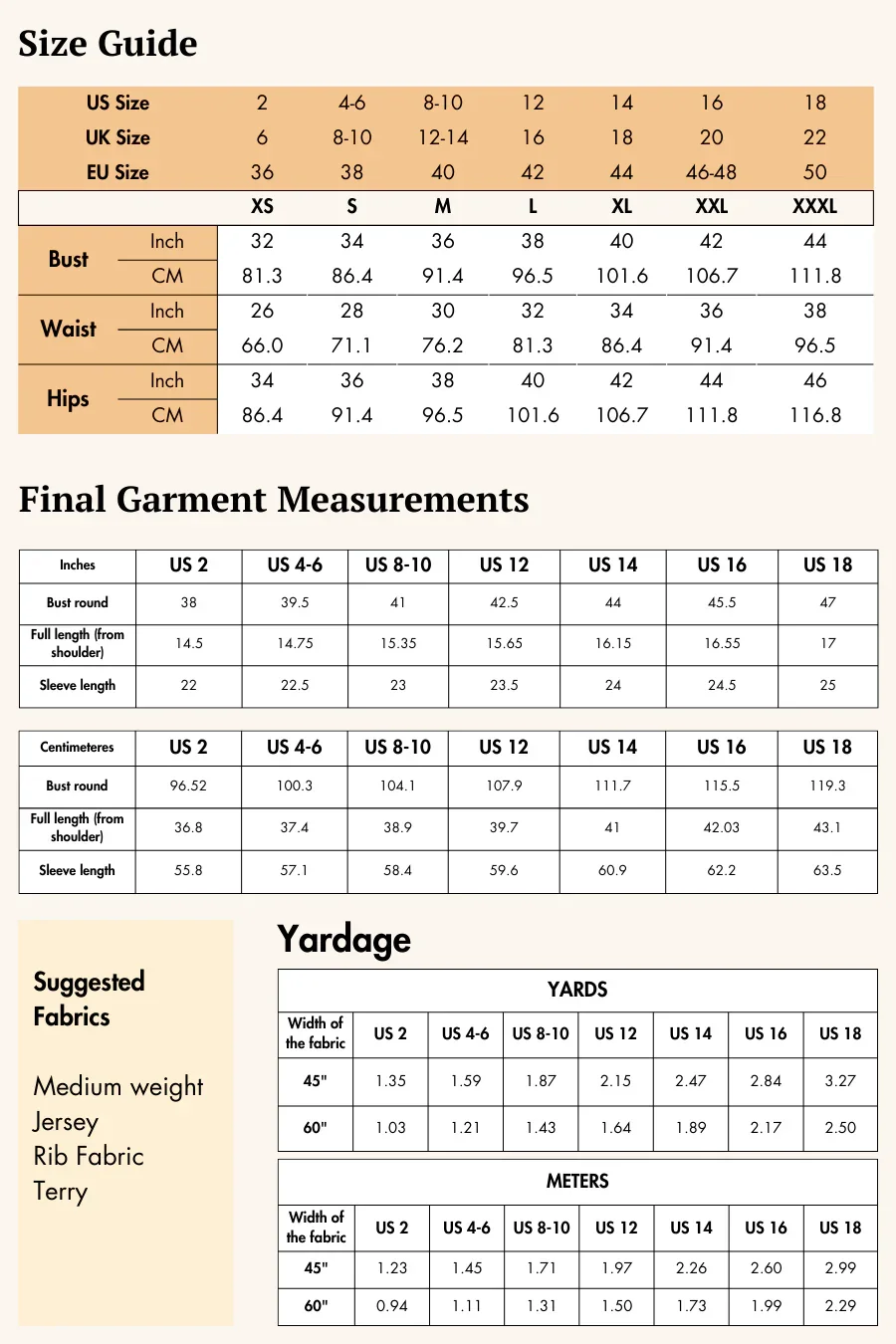 Before selecting a pattern size, take accurate measurements of your bust, waist, and hips. Choose the size from our chart (details in the sewing guide after purchase) that closely aligns with your measurements.