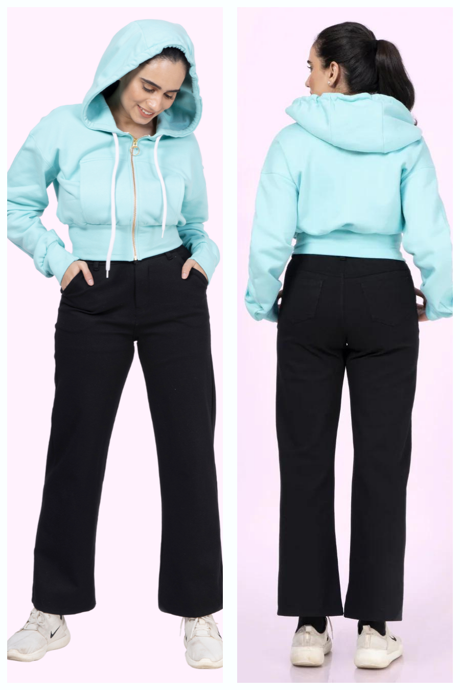 This hoodie strikes the perfect balance between comfort and style, featuring a full zip front and a cozy hood. The wide ribbed waistband allows for a snug, cropped fit that's right on trend.