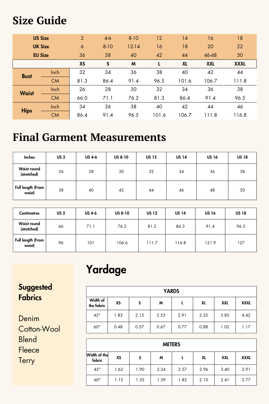 Our sewing patterns are initially designed based on a basic block drafted for a woman with the following measurements: height 5'6", bust 34", and waist 28", corresponding to size S on our size chart. From there, the patterns are graded both up and down to accommodate various sizes.